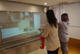 大型スクリーンにコンロ火災の映像が映し出され、画面上の炎をめがけて、水消火器で消火体験ができます。
