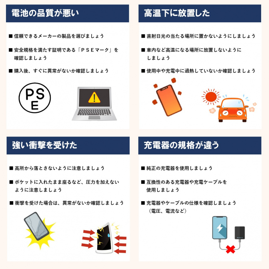 ※ 膨張、異音、異臭など異常が生じた際は、使用をやめましょう。