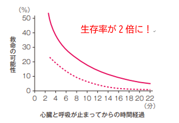 救急現場では、救急隊が到着するまでのわずかな時間が、傷病者の命を左右する重要な時間です。その間に、居合わせた人(以下「バイスタンダー」という。)が行う応急手当は、救命率を大きく高める効果があります。
