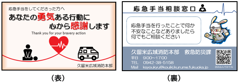 この体制は、バイスタンダーの方に感謝の気持ちをお伝えするとともに、応急手当の実施に伴う不安や悩みの解消を図る支援として、「バイスタンダーサポートカード」をお渡しし、相談窓口等の情報をご案内します。