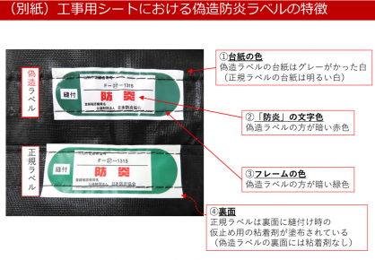 偽造防炎ラベルが貼付された工事用シートにご注意ください! 消防法第8条の3において、政令で定める防火対象物で使用する防炎対象物品は一定の防炎性能を有するものとし、その旨を表示しなければならないこととされています。 今般、防炎対象物品である工事用シートについて、防炎協会が交付したラベルに酷似したラベル(以下偽造ラベル)が貼付され、販売されている事案が発生しています。偽造ラベルは製造者・流通経路が不明で、防炎性能を有しない製品が含まれる可能性があるため、こうした偽造ラベルが貼付された模造品を使用しないよう、ご注意ください。