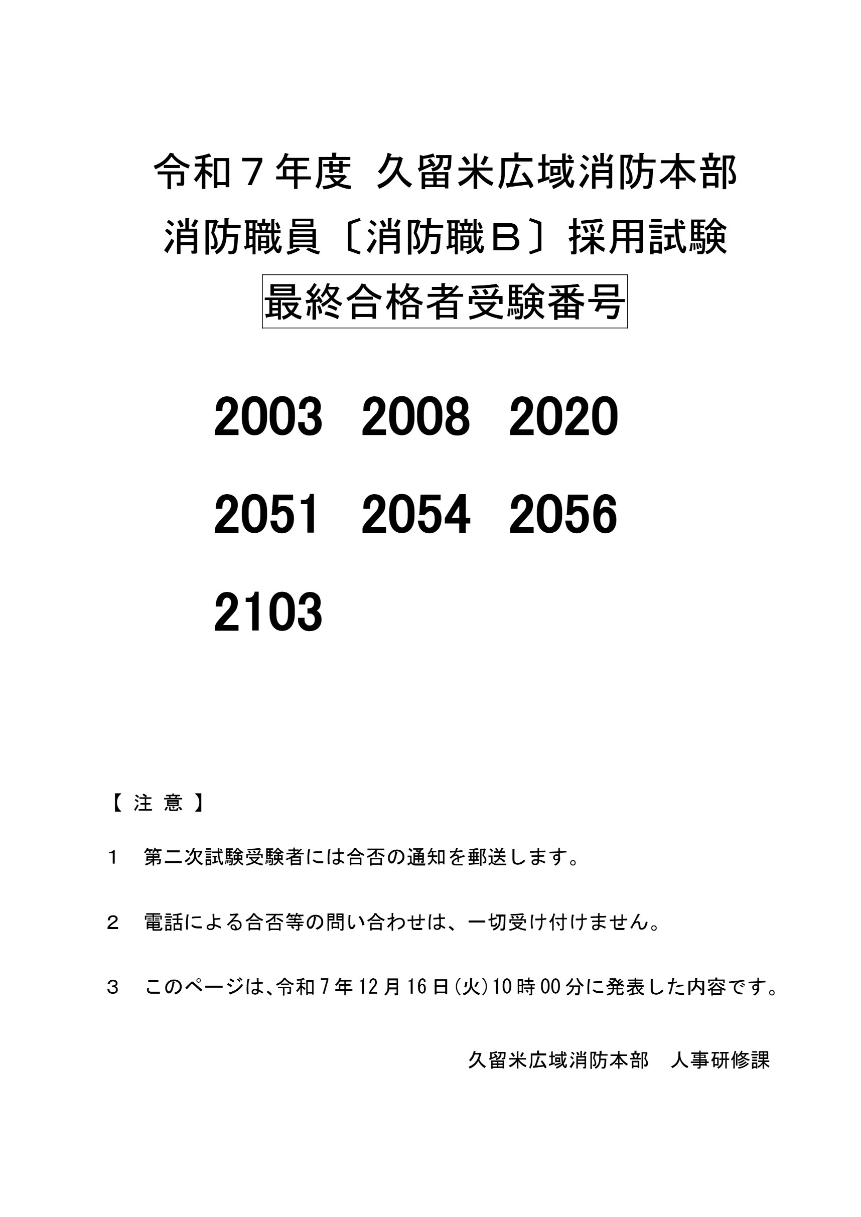令和7年度 消防職員【消防職B】採用試験の最終合格者について 【お問合わせ先】 〒830-0003 久留米市東櫛原町999番地1 久留米広域消防本部 人事研修課 電話番号:0942-38-5163(直通)
