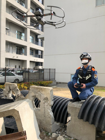 上空から通常の映像や赤外線カメラの映像をを使用して災害状況の確認ができるドローンを配備しました。