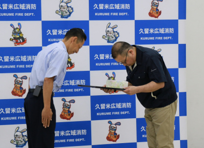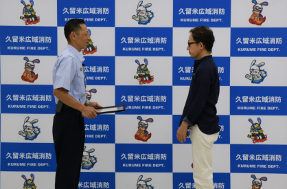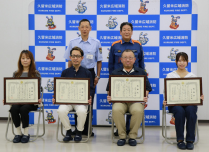 三潴消防署(署長 北川 英二)では、令和6年5月27日(月)の10時から、勇気ある行動と連携した活動を行った4名の方々に署長感謝状を贈呈いたしました。