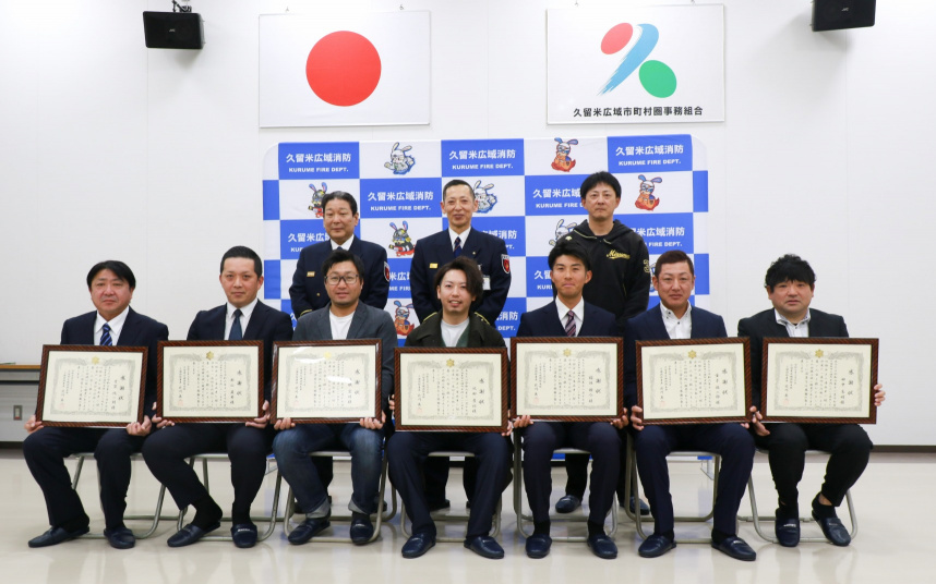 三潴消防署は令和7年3月6日、心肺停止となった男性の救助活動に貢献した9名に対し、署長感謝状を贈呈しました。