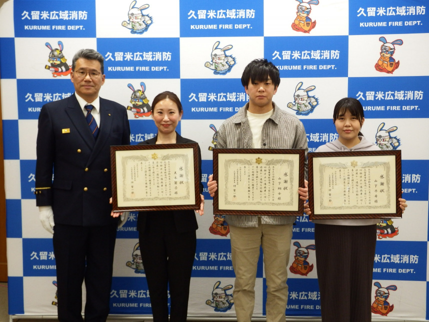 この3名の方々は、久留米市内の飲食店で心肺停止となった40代男性のもとに駆け寄り、119番通報及び胸骨圧迫を行うとともに、AEDによる除細動を実施するなど協力して救命活動を行い、救急隊に引き継ぎました。