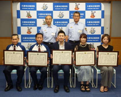 この5名の方々は、久留米市内の商業施設で心肺停止となった60代の男性に対し、119番通報や胸骨圧迫、AEDによる除細動を協力して行い、救急隊に引き継ぎました。