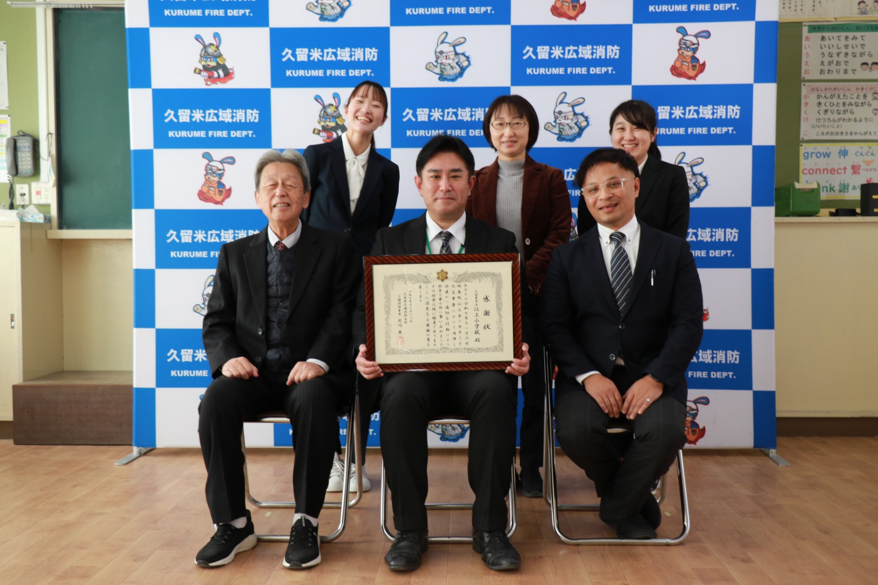 令和7年12月18日(木)、久留米市立江上小学校において、火災発生時の初期消火活動にご協力いただいた同校の先生方6名に、三潴消防署長から感謝状を贈呈しました。
