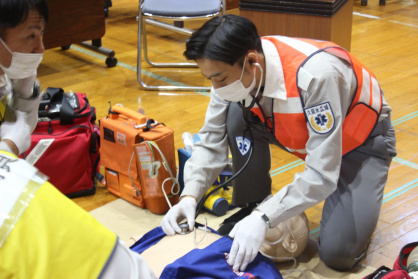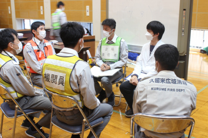 3次医療機関の医師を招き救急シミュレーション訓練を実施 令和5年10月17日(火)、19日(木)、24日(火)、26日(木)に、3次医療機関である久留米大学高度救命救急センター、聖マリア病院の医師を招き、救急隊員135名を対象に救急シミュレーション訓練を実施しました。 本訓練は、救急隊の判断や処置の妥当性について直接医師から指導を受け、救急隊の知識及び技術の向上を図ることを目的としています。