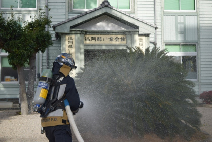 【三潴署】国登録有形文化財において初の訓練を実施 「福岡県い業会館」で合同火災訓練 令和6年1月23日(火)、令和2年に国登録有形文化財に登録された「福岡県い業会館」において、初めて合同訓練を実施しました。 訓練は、全国的に展開されている文化財防火デーに係る行事の一環として、住民の文化財愛護意識の高揚と火災予防の徹底を図ることを目的に実施しました。 訓練には、福岡県い業会館職員、大木町消防団、地域住民及び三潴消防署が参加し、文化財を後世に受け継ぐ大切さを関係者一同で確認することができました。