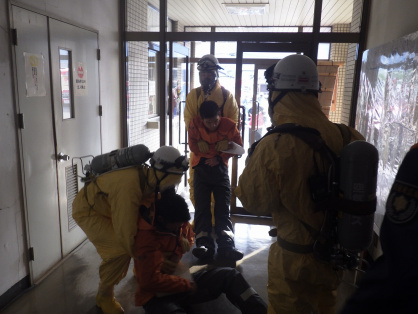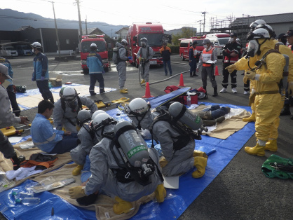 この訓練は、工場内で有毒ガスが発生し、逃げ遅れた人が数名いるとの想定で、救助隊による救出、消防隊による除染、救急隊による応急処置など、各隊が連携して活動しました。