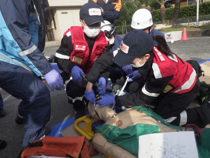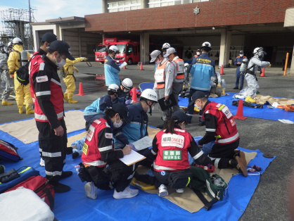 また、田主丸中央病院DMATも訓練に参加し、救護所での傷病者の観察や処置などの活動を行いました。訓練後には消防・DMATとの意見交換を行い、お互いの情報を共有することができました。