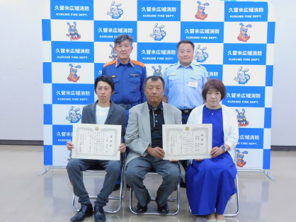 浮羽消防署では、この3名の勇気ある行動に感謝の意を表し、「応急消火協力者」として感謝状を贈呈いたしました。