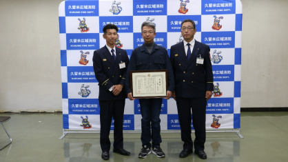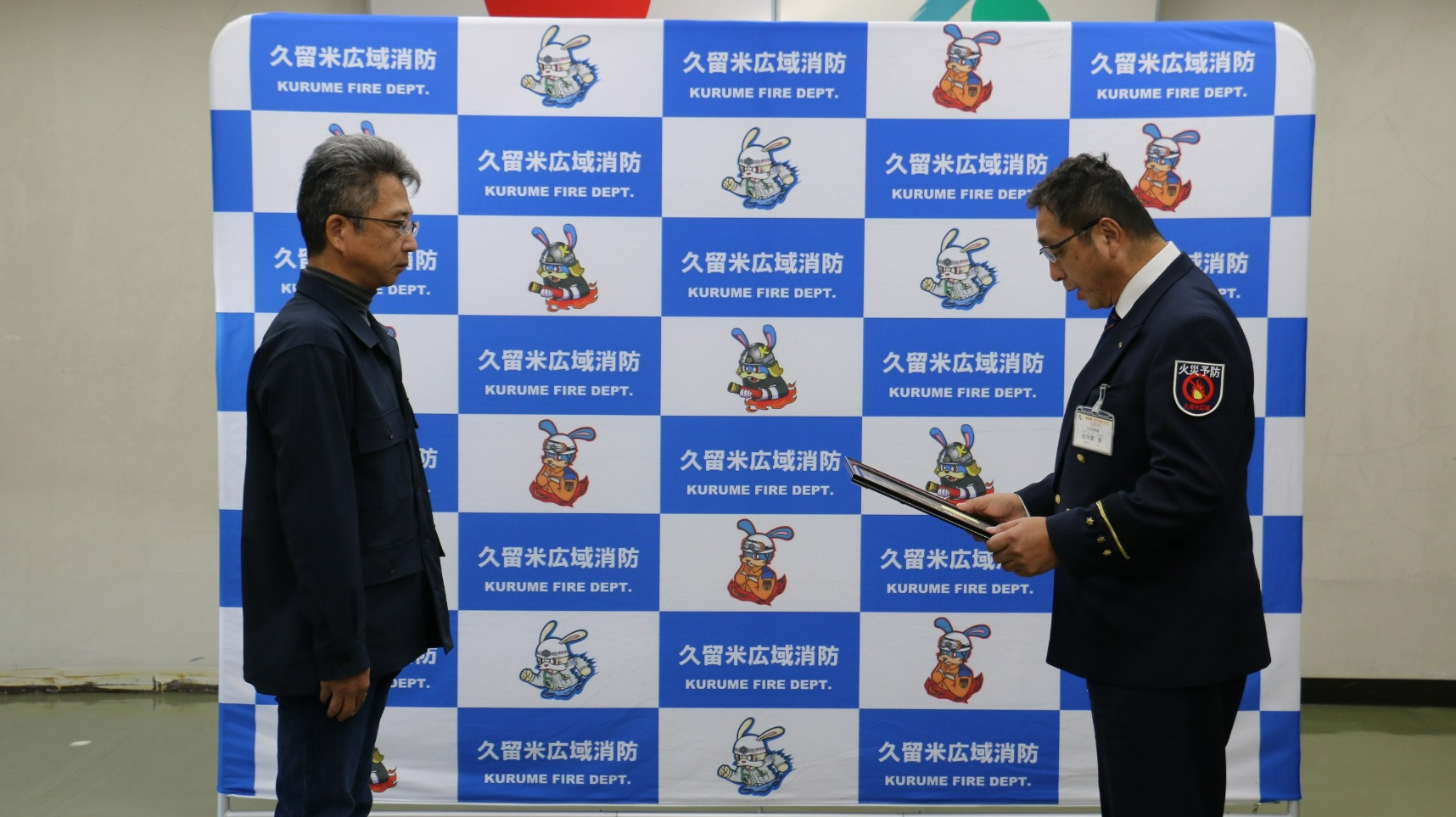 令和7年11月10日(月)、三井消防署は、初期消火の協力者に対して署長感謝状を贈呈しました。