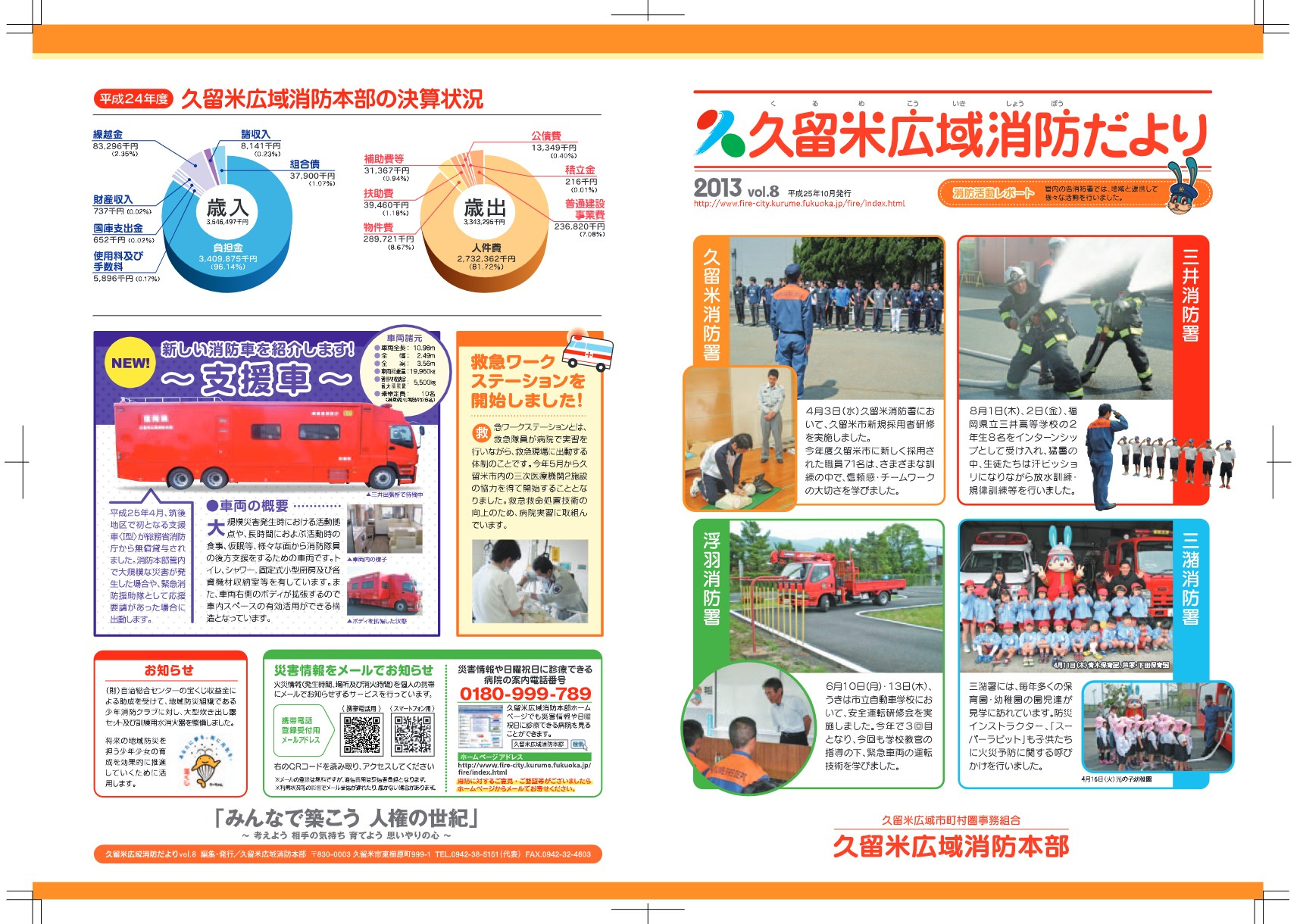 久留米広域消防だより 最新号 Vol.32(2025年9月発行) バックナンバー Vol.31(2025年4月発行) Vol.30(2024年9月発行) Vol.29(2024年4月発行) Vol.28(2023年9月発行) Vol.27(2023年4月発行) Vol.26(2022年9月発行) Vol.25(2022年4月発行) Vol.24(2021年11月発行) Vol.23(2021年4月発行) 創刊号~Vol.22 Vol.22(2020年9月発行) Vol.21(2020年4月発行) Vol.20(2020年1月発行) Vol.19(2019年4月発行) No.18(2018年12月発行) Vol.17(2018年7月発行) Vol.16(2017年10月発行) Vol.15(2017年4月発行) Vol.14(2016年10月発行) Vol.13(2016年4月発行) Vol.12(2015年10月発行) Vol.11(2015年4月発行) Vol.10(2014年10月発行) Vol.9(2014年4月発行) Vol.8(2013年10月発行) Vol.7(2013年4月発行) Vol.6(2012年10月発行) Vol.5(2012年4月発行) Vol.4(2011年10月発行) Vol.3(2011年4月発行) Vol.2(2010年10月発行) 創刊号(2009年12月発行)