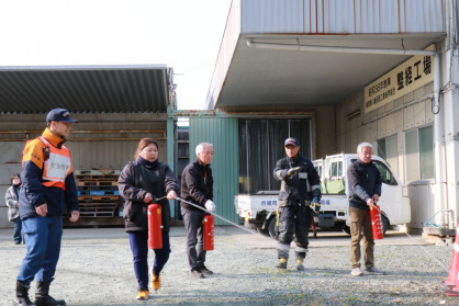 訓練では、福岡県い業会館職員による初期消火訓練をはじめ、大木町消防団と三潴消防署が合同で消火活動および人命救助訓練を行いました。